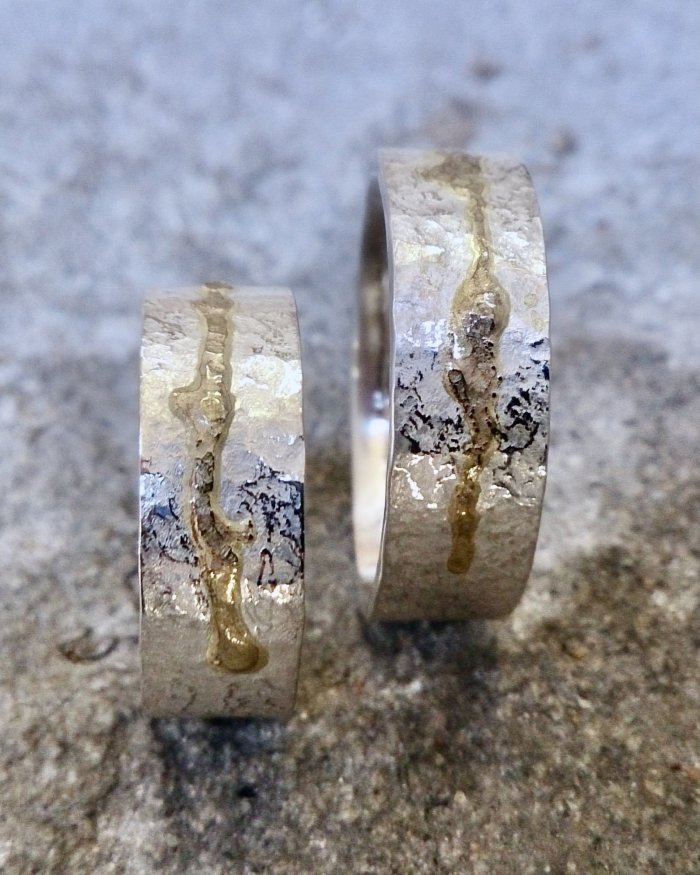Ringe aus Silber mit Goldlinie, geschmiedete Oberfläche
